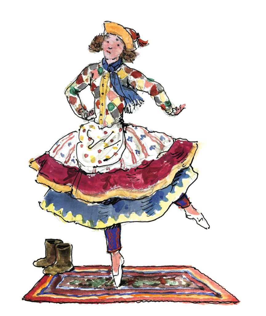 Внутри балагана видны три куклы на штативах: слева Арап, посередине Балерина, справа Петрушка. Куклы начинают плясать, вначале на месте, а потом и среди толпы. Балерина, пустенькая кокетка, танцует то с одним, то с другим. Петрушка, ревнуя ее к Арапу, ударяет соперника палкой.