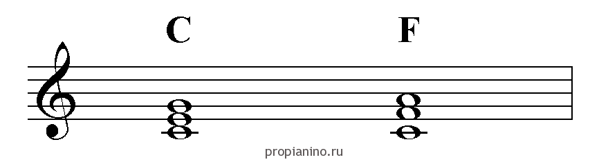 Например, чтобы соединить аккорды C и F, достаточно поменять расположение всего двух нот: ми и соль меняем на фа и ля (на одну клавишу выше). При этом нота «до» остается на месте. Это намного легче, чем переносить полностью руку с основного вида аккорда C к основному аккорду F (фа-ля-до).