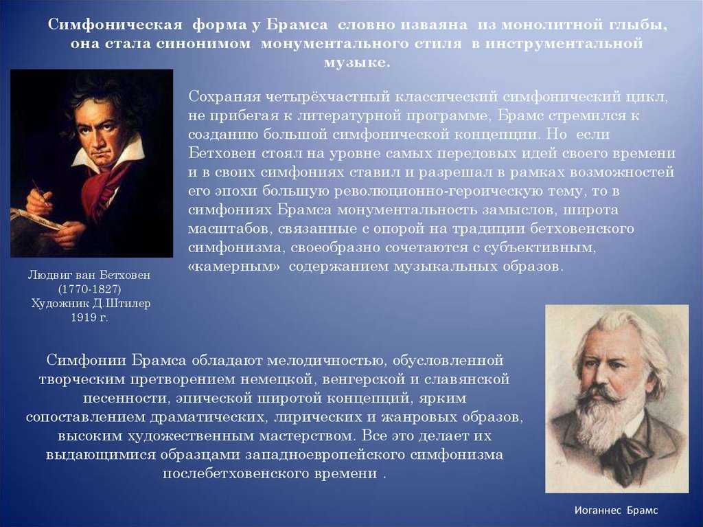 Композитор придерживается традиций Бетховена в сочинении симфоний. Это будет замечено многими, а Г. Бюлов даже назовет его первую работу «10-й симфонией Бетховена». Творчество Брамса на этом поприще носит характер классической ясности и завершенности, а форма выделятся своей четкостью и стройностью. Он написал серию композиций для фортепиано, наполнив их Шуманскими и Шубертскими мотивами, которые привнесли новую романтическую глубину, а его композиции для скрипки заняли центральное место между концертами Чайковского, Бетховена и Мендельсона.