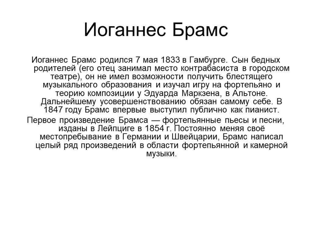 Иоганнесу Брамсу, родившемуся 7 мая 1833 года, повезло, потому что он стал сыном творчески одаренного немца Иоганна Жакоба, владевшего струнными и духовыми музыкальными инструментами. При молчаливом согласии жены Джоанны Ниссен, трудившейся домашней швеей, Иоганн начал обучать среднего сына нотной грамоте и азам игры на скрипке и виолончели.