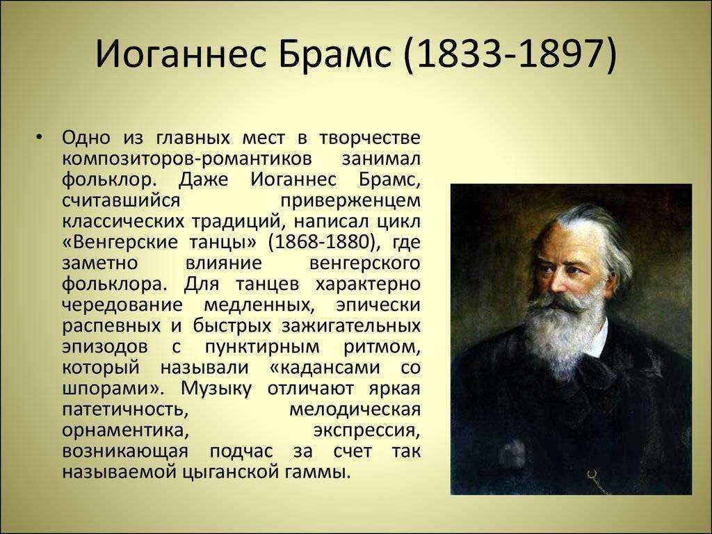 Известный немецкий композитор Иоганнес Брамс был рожден 7 мая 1833 года, а умер 3-го апреля 1897-го. Его семья не жила в достатке, но мальчика сумели обучить музыкальной грамоте. Первым учителем становится его отец, который был валторнистом и контрабасистом в небольшом ансамбле и давал концерты в Гамбургских несерьезных заведениях. С ранних лет мальчик начал подрабатывать разными способами. Он выступает в ресторанах, принимает приглашения дать концерты в гостях разных богатых людей, занимается аранжировкой музыки и переписыванием нот. Уроки композиции берет у Э. Марксена, а игре на фортепиано Брамса обучает Ф. В. Косссель. В 1853 году он знакомится с венгерским эмигрантом, который покинул свою родину из-за революции 1848-го года, Э. Ременьи. Эта встреча оставила глубокий след в творчестве немецкого композитора. Будучи аккомпаниатором Ременьи, он проникается колоритом венгерской музыки,. На основе этого он позже напишет свои «Венгерские танцы» и много других произведений включая в них мелодику и ритмику национальных песен этой страны.