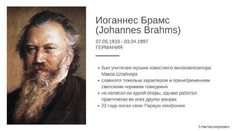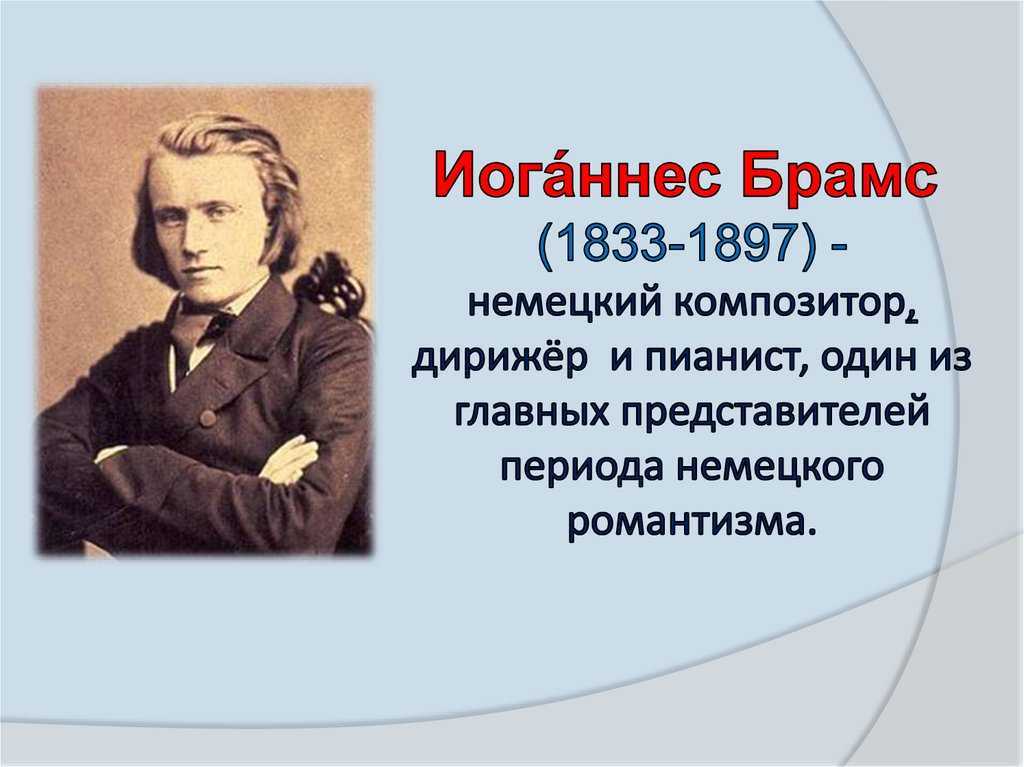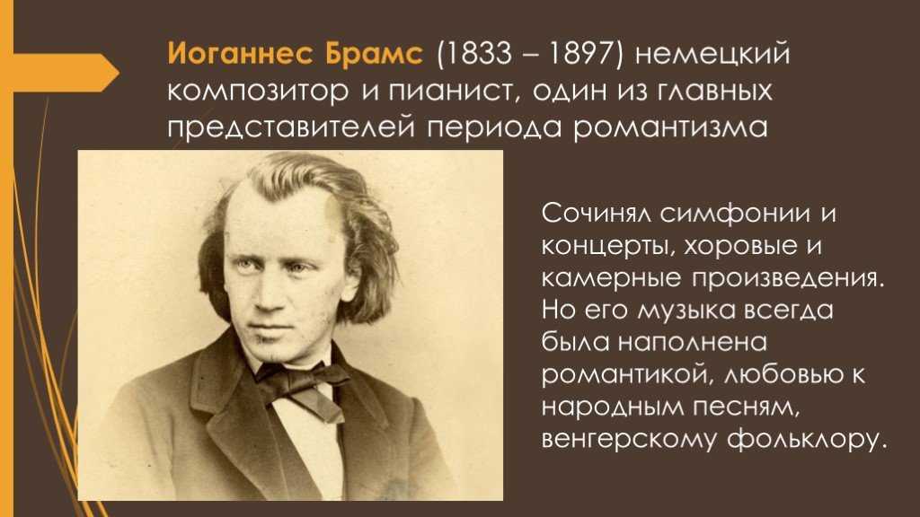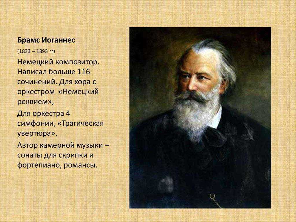 Брамс был известным и широко популярным немецким композитором, которого любила и уважала публика. Свои сочинения он наполнял народностью и национальными мотивами разных стран, придавая им жизненного реализма. Он сделал многое для развития музыкальной стороны культуры XIX столетия.