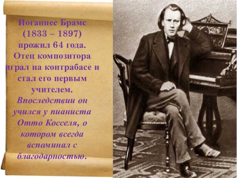 В 1842 году мальчика отдали на попечение педагога Отто Косееля, чтобы овладеть основами композиции и фортепиано. Благодаря руководству опытного наставника в 10-летнем возрасте Брамс начал давать концерты, а в 1845 году мальчик сочинил первую самостоятельную сонату.
