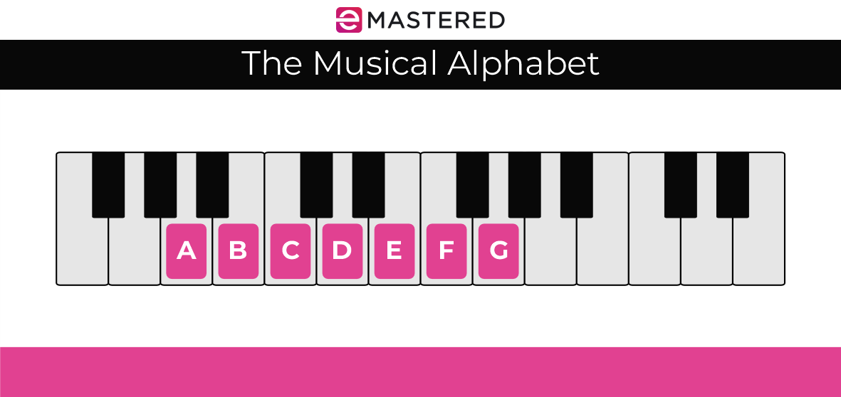 Музыкальный алфавит начинается с A-G и повторяется, когда ноты становятся выше. На фортепиано все белые ноты называются именно так: