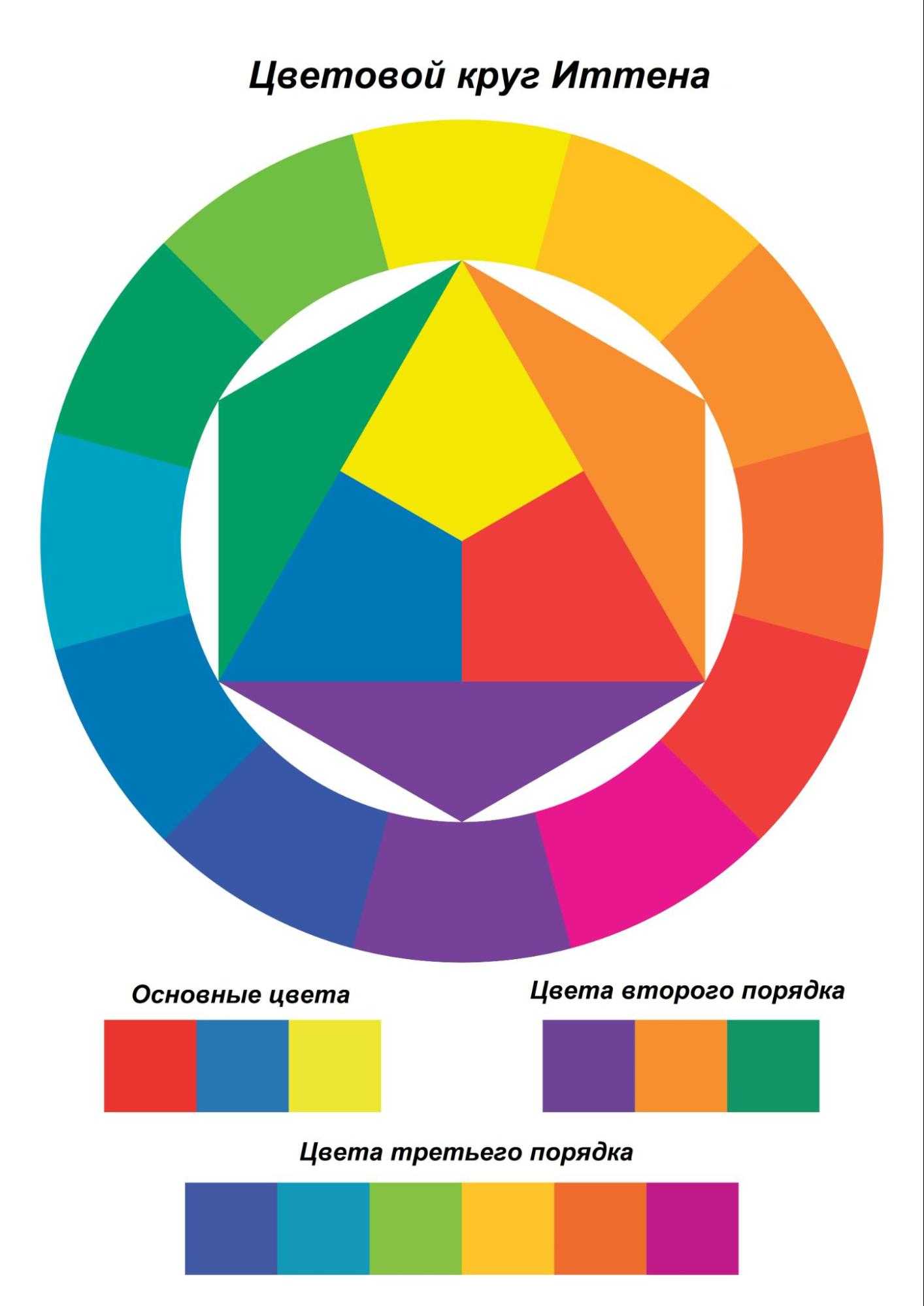 Так выглядит 12-частный круг Иттена. Три основных цвета размещены в центре круга. Если смешивать каждые два основных цвета, то получатся цвета второго порядка: желтый + красный = оранжевый, желтый + синий = зеленый, красный + синий = фиолетовый. Цвета третьего порядка — те, что во внешнем кольце круга, создаются, если смешать основные цвета и цвета второго порядка.