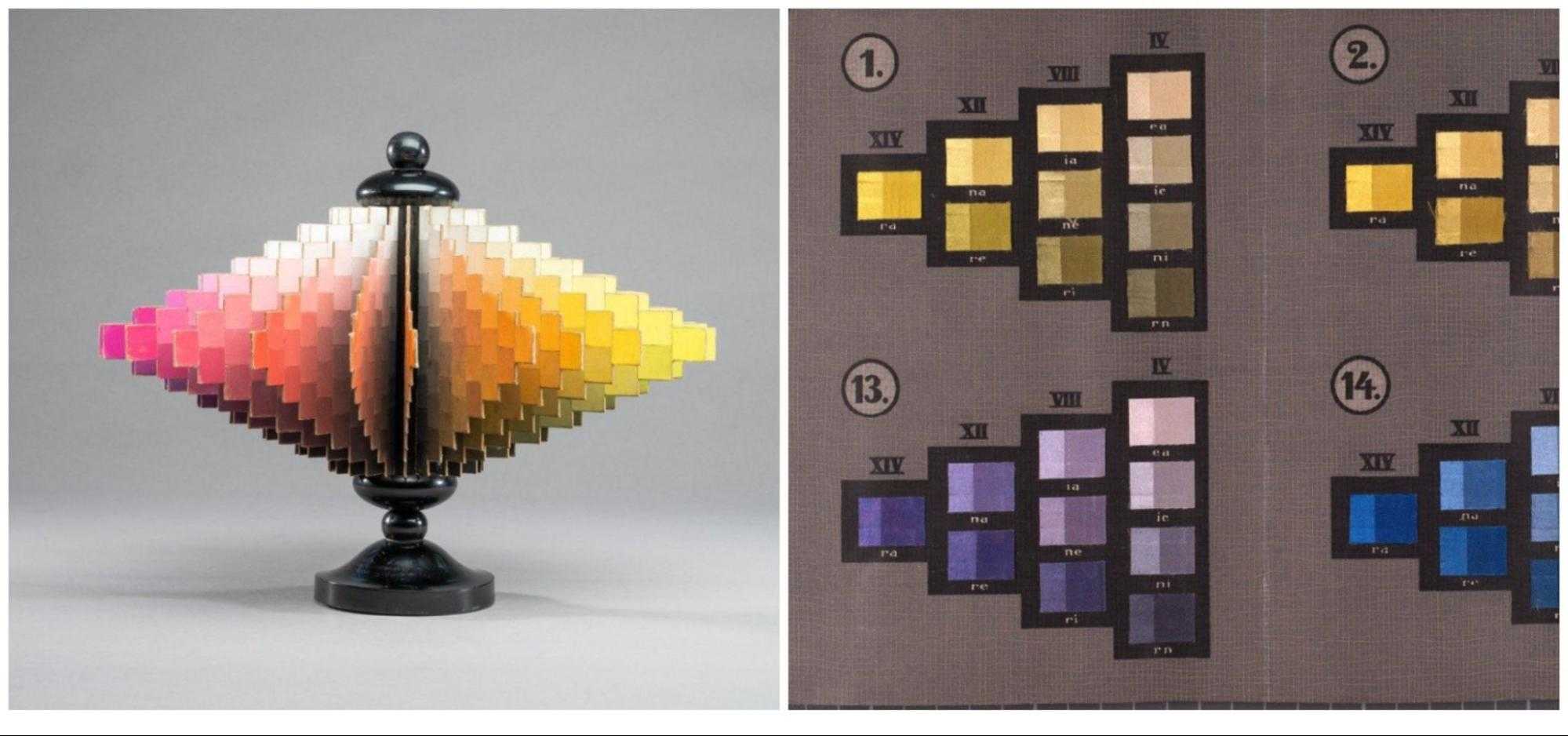 Цветовой круг Оствальда или, правильнее сказать, цветной конус Освальда (Ostwaldscher Doppelkegel) — это объемная модель из 24 цветов, разбитых на сегменты. Каждый цвет Оствальд поделил на восемь ступеней, различающихся по светлоте и насыщенности. На фото слева цветовая модель Оствальда от 1918 года. На фото справа ступени одного цвета из модели Оствальда, 1928 год.