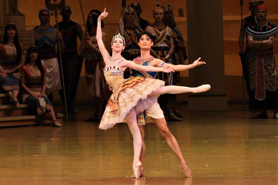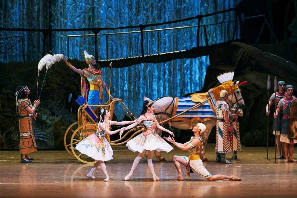 Мариинский спектакль прежде всего по объему, по продолжительности больше, чем спектакль Большого (3 часа 30 минут вместо 2.45). История все та же, но в ней больше персонажей. Например, когда Аспиччия сбегает из дворца (папа фараон хотел в дипломатических целях выдать ее за нубийского царя, а не какого-то невесть откуда взявшегося Таора) и, преследуемая нубийцем, прыгает в Нил и оказывается во владениях речного правителя. Нил приглашает ее на бал, где танцуют реки со всего мира. В московской версии нам показывают танцы лишь Гвадалквивира, Конго и Невы (испанский, китайский и русский танец соответственно — да, у Петипа было плохо с географией, он считал, что Конго протекает в Китае). В Петербурге — полная компания, как в XIX веке: щелкающий кастаньетами Гвадалквивир (Мария Чернявская), простодушная Темза (Биборка Лендван), стеснительный, убирающий руки за спину Рейн (Влада Бородулина), бурный, экспансивный Тибр (Шамала Гусейнова), похожая на фарфоровую куколку Хуанхэ (Дарья Устюжанина; да, Петипа поправили) и цитирующая движения русского народного танца, заканчивающая выступление поясным поклоном Нева (Ксения Фатеева).