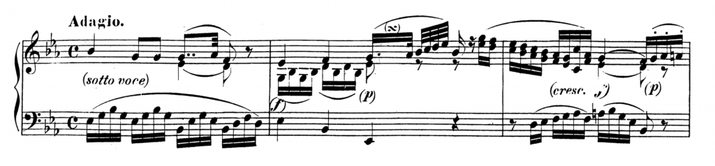 Медленная часть сонаты – это Adagio в Es-dur. Как и лирические части моцартовских симфоний, оно написано в сонатной форме.