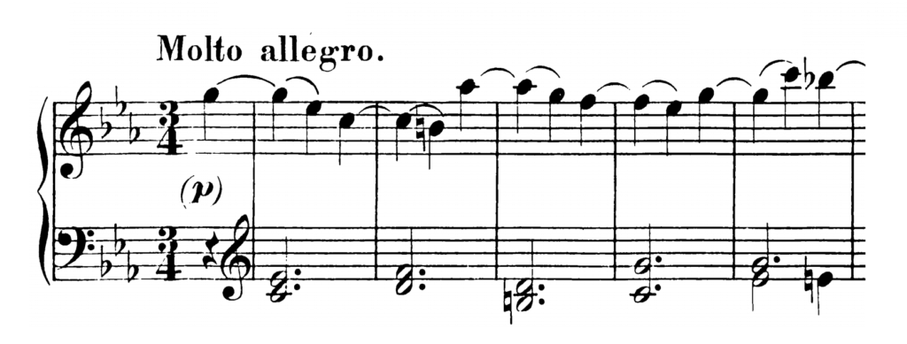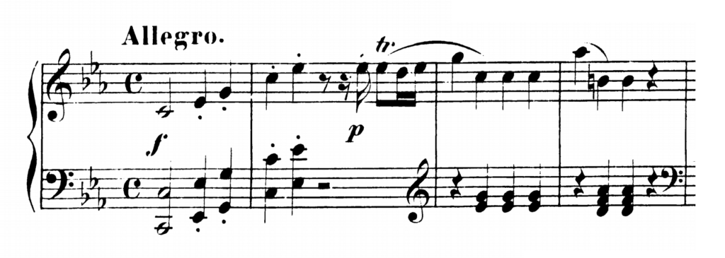 Заголовок говорится смело октав , дважды встречается в первые 8 барах. Субъект не остается сильным до перехода , при котором открывающий мотив взят на октаву выше, а масштаб -типа прохода модулирует ключ к относительно крупной , E ♭ главный. Вторая тема содержит несколько очень изящных мелодий, поддерживаемых басом Альберти , которые продолжаются до второй половины произведения. В этом разделе для формирования разработки используются материалы по первому и второму предметам . Гармонически наиболее нестабильная секция, она проходит через тональность до мажор , фа минор , соль минор и возвращается к исходной партии до минор. Перепросмотр происходит из бара 100 до 168, на этот раз второй объект находится в миноре вместо E ♭ основной экспозиции, и кода заканчивает часть из бара 168 до 185.