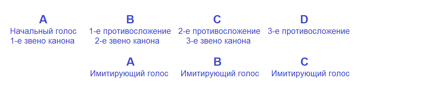 Каноническая, она же непрерывная имитация – более сложный прием, при котором повторяется не только ранее прозвучавший отрывок, но и противосложение. Вот как это выглядит схематически: