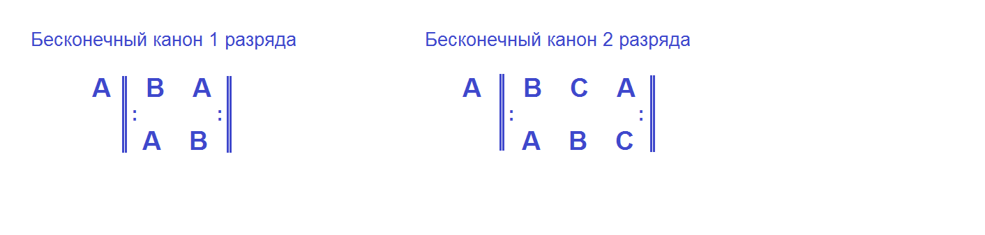 Поясним, что под бесконечным каноном 1-го разряда подразумевается имитация с 2-мя звеньями, а под бесконечным каноном 2-го разряда – имитация с количеством звеньев от 3-х и более.