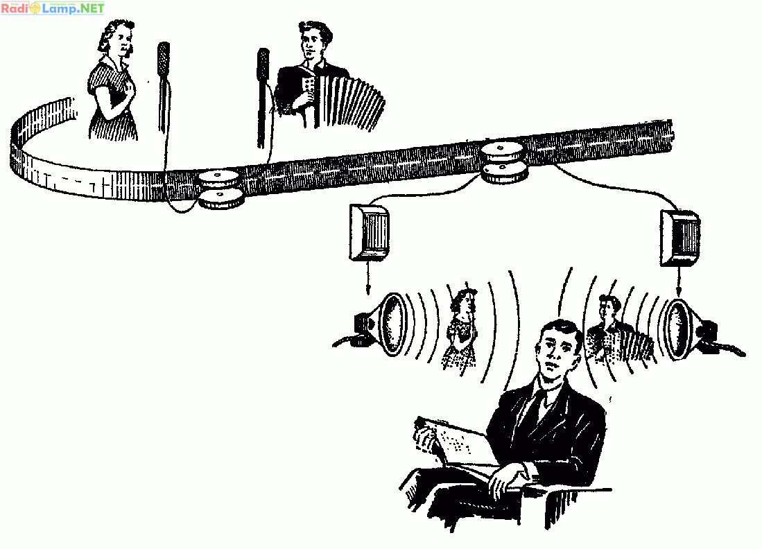 Можно ли каким-нибудь путем осуществить стереофоническое воспроизведение звука! Конечно, можно. Для этого на сцене достаточно установить несколько микрофонов, в помещении, куда транслируется передача, разместить в таком же порядке громкоговорители, каждый из которых соединяется с соответствующим микрофоном. При такой системе громкоговорители почти в точности воспроизведут звуковую картину, существующую на сцене.