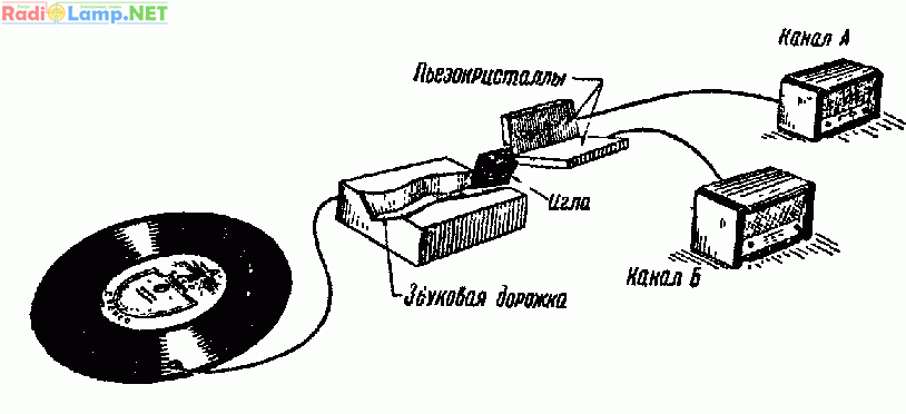 Воспроизведение стереофонических записей осуществляется с помощью специального звукоснимателя, в котором вместо одного пьезокристалла имеются два, расположенные под углом 90° один относительно другого. Благодаря такому расположению электрический сигнал на одном из кристаллов появляется лишь под действием изгибов левой стенки звуковой канавки, а на другом кристалле — под действием изгибов правой стенки. Так осуществляется разделение каналов стереозаписи.