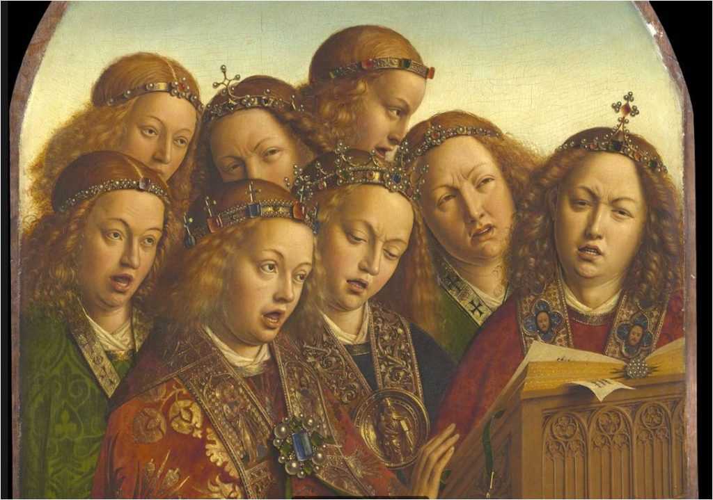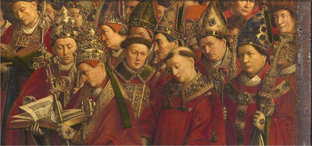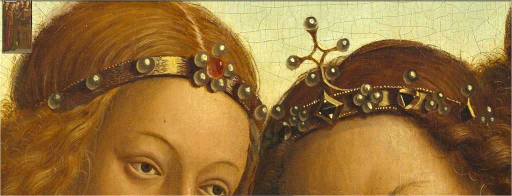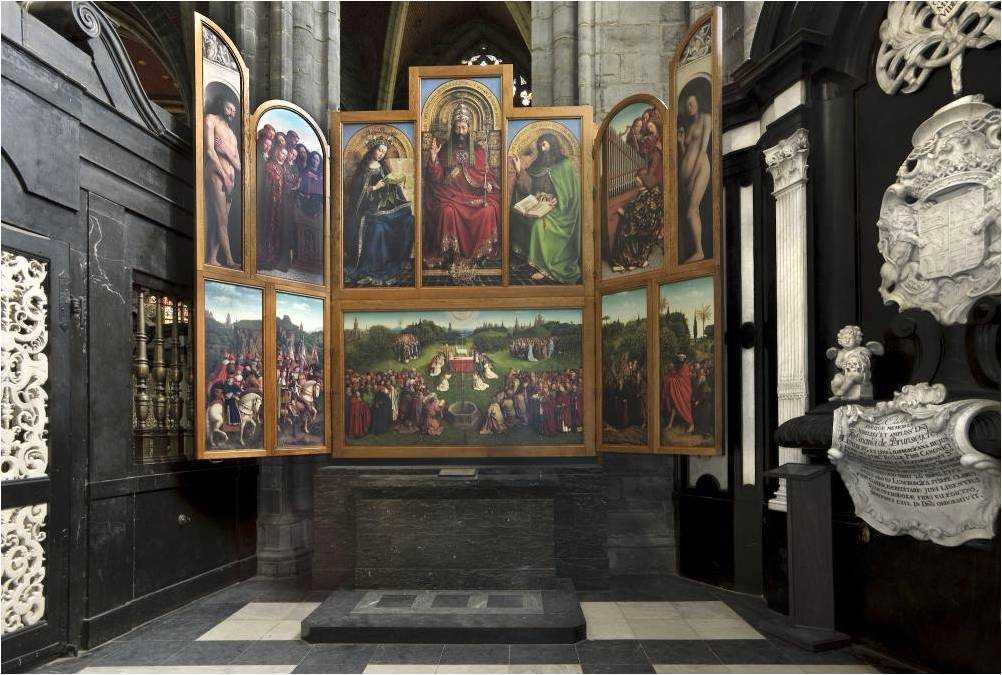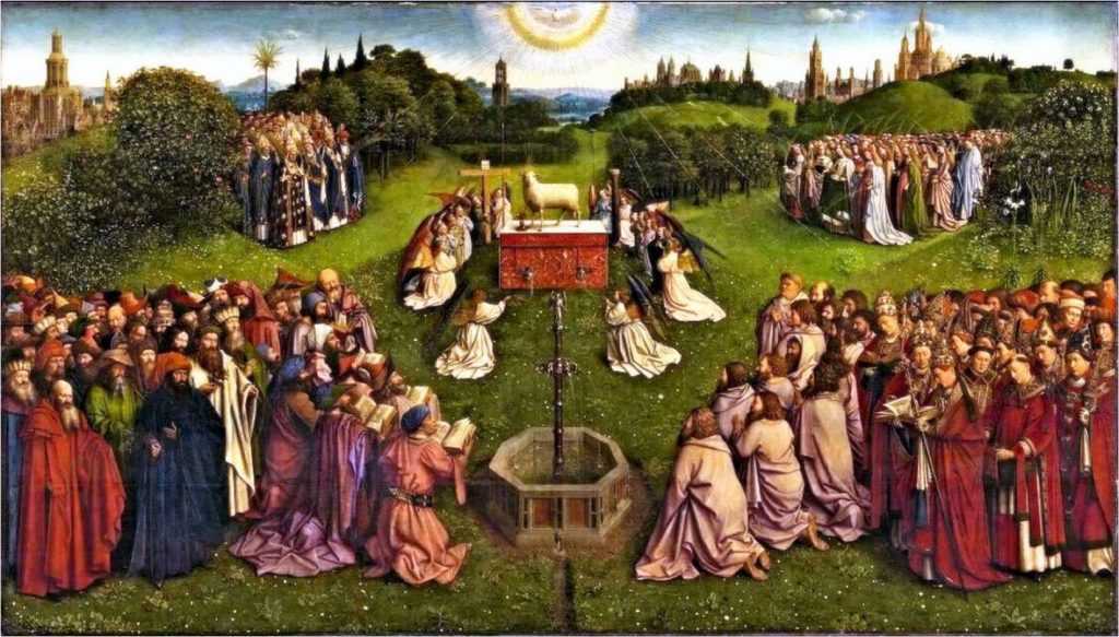 Может показаться странным, что ван Эйк небесные реальности облекает в реалии своего времени. Тем самым ему удается глубже выразить тайну брачного союза неба и земли, взаимопроникновение Божественного и человеческого. Словно сама вечность просвечивает сквозь истончившееся время. Алтарь нередко сравнивают с магическим кристаллом, в котором земная реальность предстает в ослепительном сиянии, преломляясь в лучах внутреннего света. Каждый зритель найдет здесь именно то, что утолит его жажду.