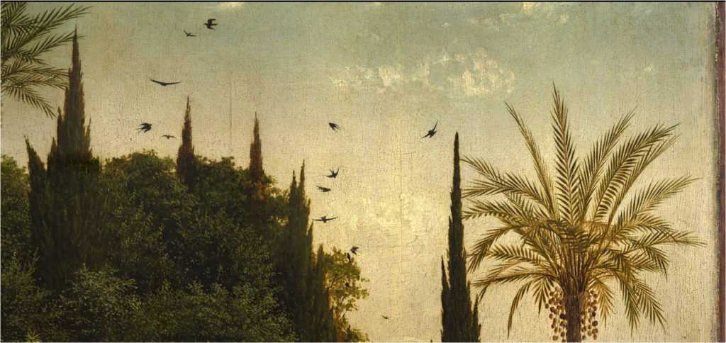 Применительно к живописи ван Эйка принято говорить о пространстве света, она словно пронизана сиянием, которое для верующего человека служит намеком на присутствие Воскресшего. Искусство ван Эйка меняет само наше восприятие реальности, дает вкус к созерцанию присутствия Бога не только в сердце человека, но и в обыденном мире. Мы увидим, что мастер не просто создает пространство евхаристии и эсхатологического ликования, но вовлекает в это пространство и своего зрителя.