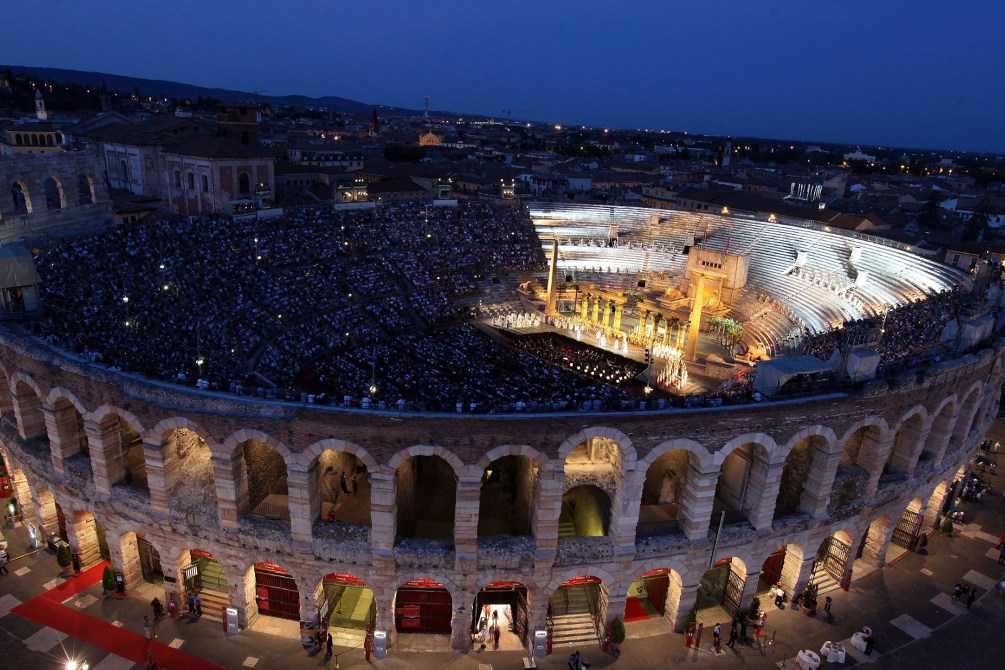 Античный римский амфитеатр известен своими оперными и концертными постановками, проводимыми в нём. Построен в 1 веке до н.э. По величине здание из розового веронского камня уступает лишь римскому Колизею. В античные времена на ней проводились гладиаторские бои, в Средние века — рыцарские турниры. В XVI и XVII вв. зрительские трибуны полностью перестроили , и нынешняя Арена представляет собой грандиозный зрительный зал на 25 тыс. мест, на сцене которого даются феерические оперные представления под открытым небом. Обладает исключительной акустикой здания. В наши дни каждый год в период с июня по август проводится , обычно, четыре различные сценические постановки. В середине июля представления даются почти каждый день. В зимние месяцы опера и балет дают представления в Академической Филармонии.