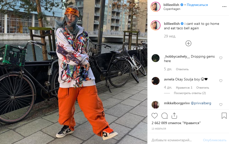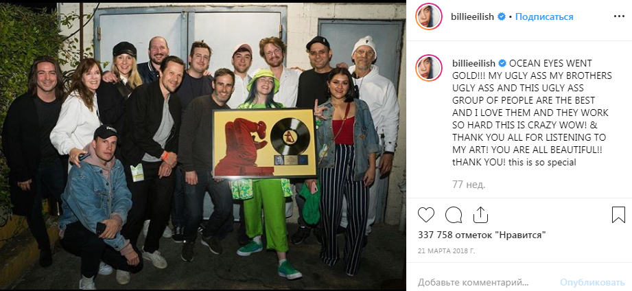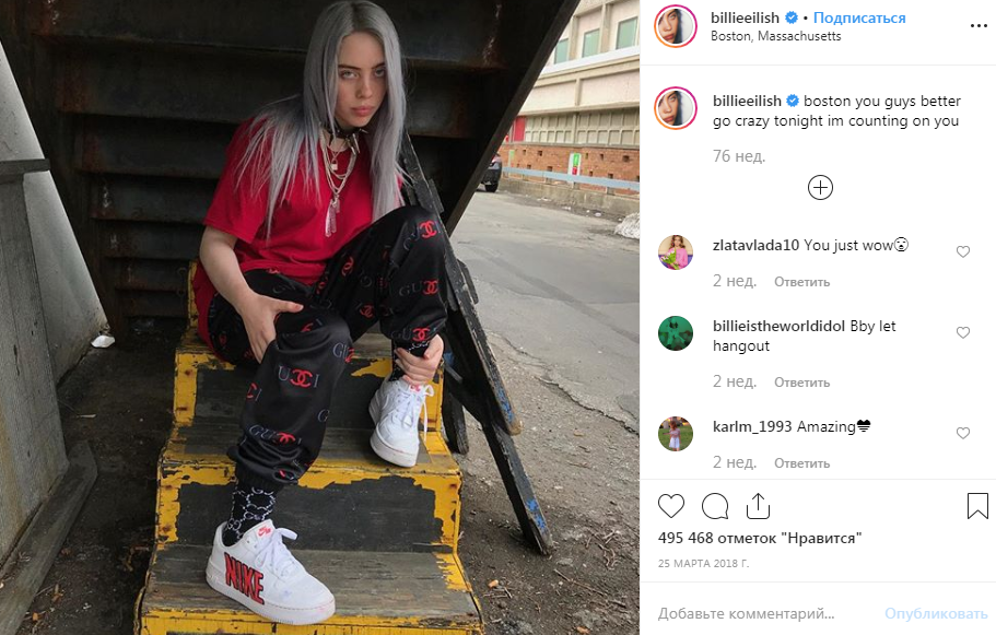 Она несколько раз побила рекорд самой быстрой понравившейся фотографии на платформе. Совсем недавно ей это удалось сделать с фотографией для Vogue, на которой Билли Айлиш изображена в новом образе и в сексуальном корсете. Пост набрал миллион лайков менее чем за шесть минут. Вы можете положиться на более чем 95,3 миллиона подписчиков Билли в Instagram (по состоянию на ноябрь 2021 года)