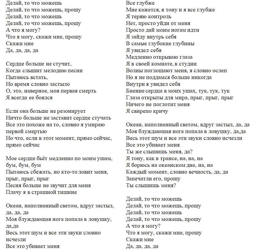 «Делай свое дело, делай то, что можешь» — эта строка идет рефреном через весь текст. Именно это можно считать основным посылом песни. Делай то, во что веришь, без оглядки и сомнений. Будь верен самому себе и не прогибайся под этот изменчивый мир, как пела Машина Времени.
