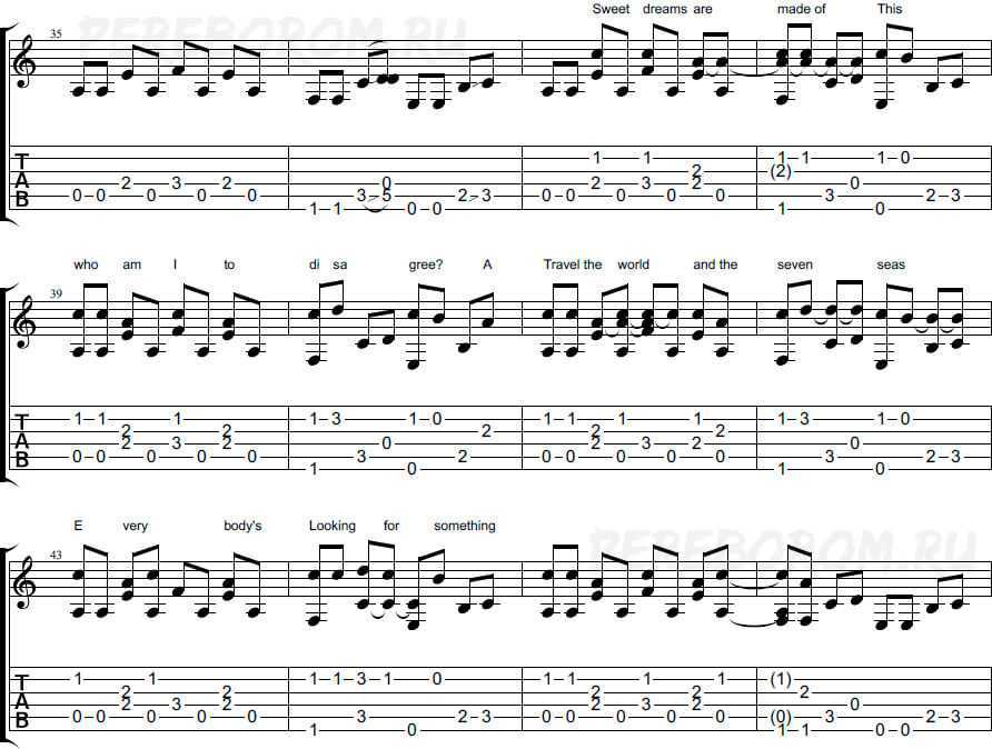 Басовую линию Sweet dreams на гитаре лучше всего исполнять большим пальцем. Для более жёсткого звучания можно использовать специальную накладку – мизраб. Так вы выделите основную басовую линию и сделаете её главенствующей в произведении