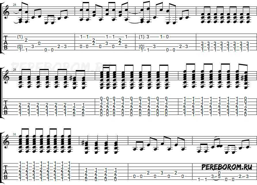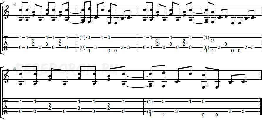 Куплет начинается с 11 лада. Принцип построения аппликатуры стоит сразу заучить. Играется бас (с мелодией или без) и чередуется с интервалом в аккорде, который играется щипком вверх. Мелодию цепляем безымянным пальцем, а бас большим. Средний голос цепляем средним и указательным пальцами. Яркий пример – 15 такт:
