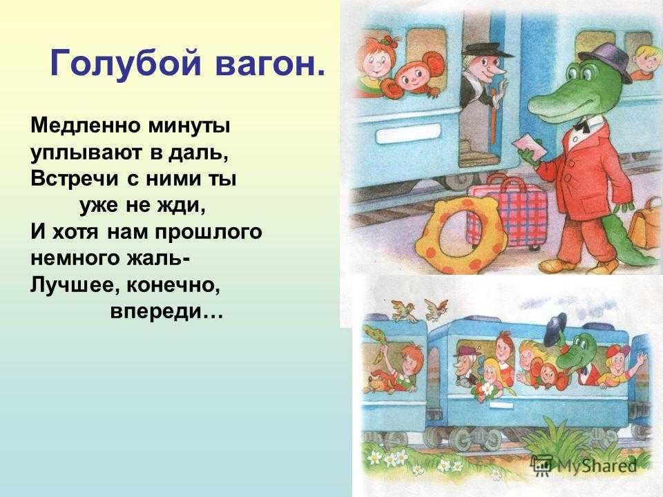 Кукольный мультфильм «Шапокляк» (он же – II часть приключений крокодила Гены и Чебурашки), в котором впервые звучали слова песни «Голубой вагон», вышел на советских экранах в 1974 году. Но и сегодня знаменитый «Голубой вагон» цепляет деток с первых строк. Удивительно легко запоминающиеся слова поэта Эдуарда Успенского, положенные на музыку гениального Владимира Шаинского, обеспечили песенке в исполнении крокодила Гены успех на десятки лет. Родители любят слушать «Голубой вагон» онлайн, вспоминая беззаботное детство. Детей она трогает простотой, понятным рассказом о том, что всем нам знакомо – дорога, приключения, все когда-нибудь кончается, но это не повод для грусти, ведь по завершении каждого дня нас ждет новое утро, полное открытий. «Лучшее конечно впереди» – фраза из песни, которая лучше всяких утешений учит ребенка главной мудрости жизни.