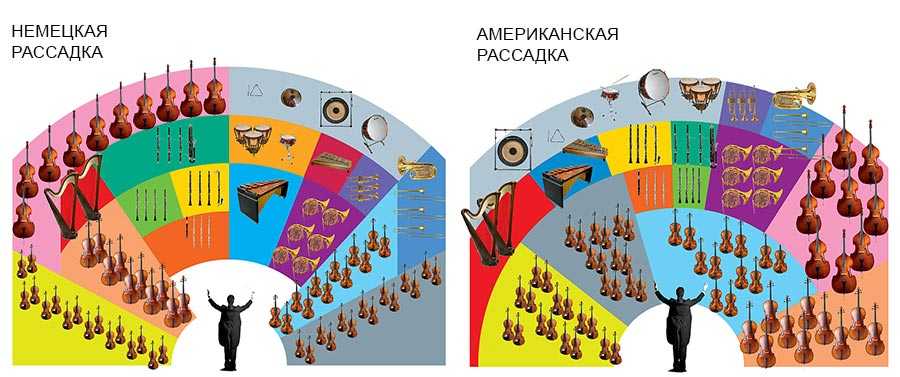 В России используют обе схемы и их комбинации. Оркестр Владимира Спивакова придерживается немецкой рассадки, Оркестр московской филармонии — американской. С оркестром Большого театра все сложнее. Там оркестровая яма, все по-другому, места гораздо меньше.