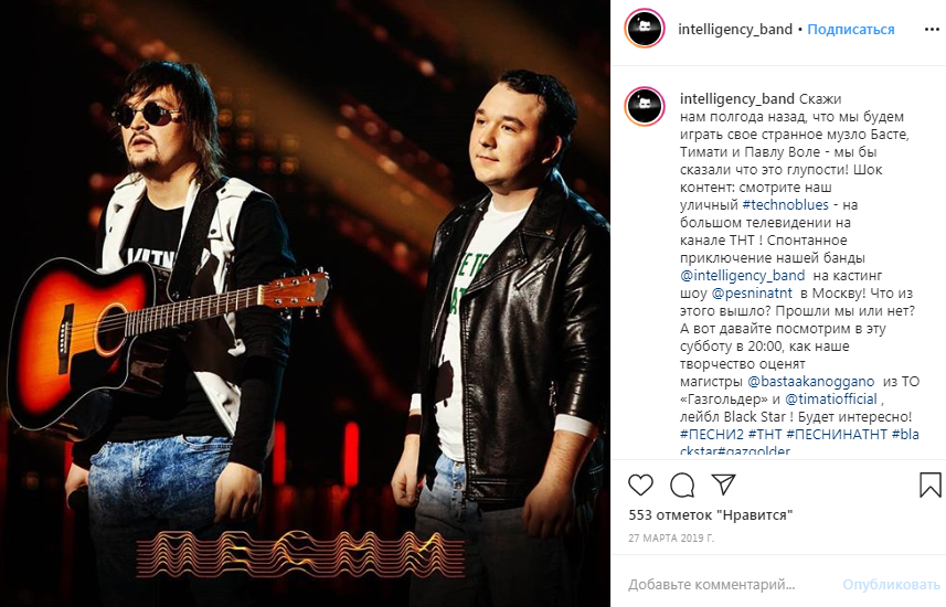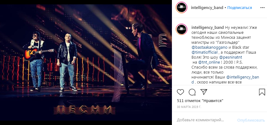 В марте 2019-го группа удостоилась чести быть упомянутой на официальном сайте проекта «TNT music», где «Intelligency» включили в материал «Топ-5 самых лучших треков «Песен на ТНТ». Члены уважаемого и компетентного жюри Баста и Тимати в седьмом эпизоде проекта стали намного строже: много музыкантов в унынии покинули сцену шоу, унося с собой отказ в продолжении кастинга. А вот белорусские таланты оставили в памяти судей неизгладимое впечатление: их слушали в полном молчании, очень внимательно, и почти одновременно нажали «белые» кнопки. Павел Воля, ведущий, не скрывал, какое впечатление на него произвела песня «Глаза»; Баста после ухода артистов заметил: «Очень необычно!», а Тимати с энтузиазмом подтвердил его слова.