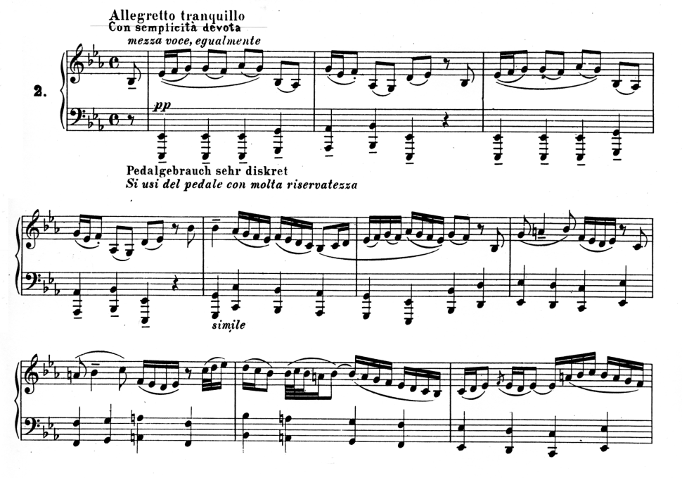В фактуре ясно выделяется три плана: верхний голос (собственно тема хорала, звучание которой в среднем регистре напоминает пение), линия баса и средний голос – интонационно очень выразительный и ритмически подвижный. Форма 2-х частная. Первый раздел ясно членится на предложения, завершается четкой каденцией. Второй развивается более непрерывно.