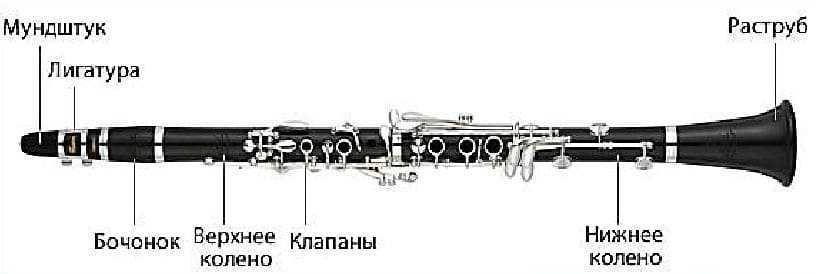Кларнет состоит из 6 основных частей, ниже на картинке: