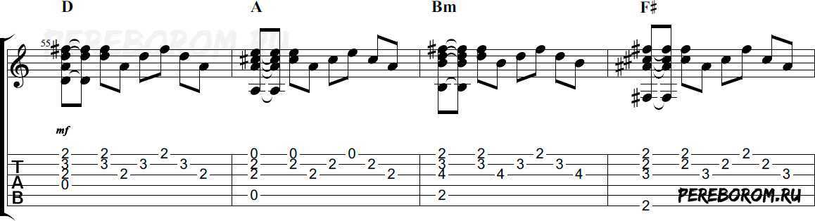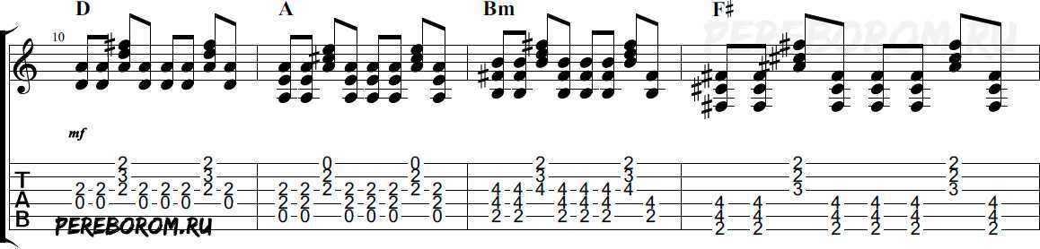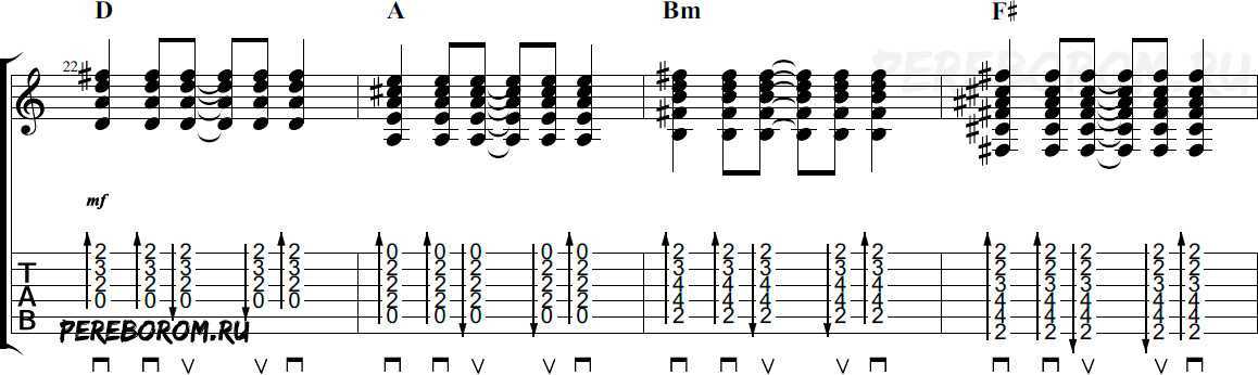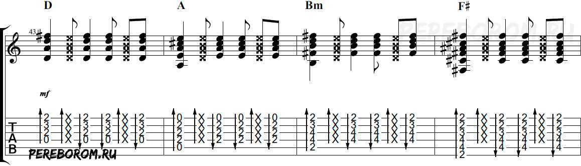 Подобный Дыхание бой применим скорее для подыгрывания второй гитарой. Играем его медиатором, все удары вниз. При этом можно чередовать пауэр-аккорды и полные гармонии. Сначала зажимаем D и чередуем сочетание 3 и 4 струны и полный аккорд. Дальше зажимаем A и медиатором бьём точно по указанным струнам.