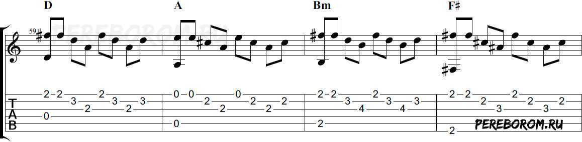 Дыхание на гитаре вторым перебором играется почти, как и первый. Одновременное извлечение баса и мелодии (безымянным). После этого начинаем арпеджио (тоже с безымянного. Здесь чередовать не нужно). Медиатором исполнять не слишком удобно, больше подходит для пальцевого извлечения. Подобный приём можно использовать также использовать в песне и в Зеленоглазое такси на гитаре.