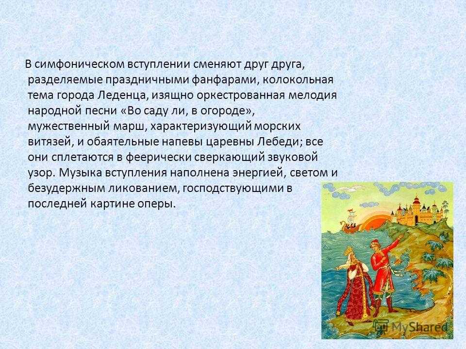 В симфоническом вступлении сменяют друг друга, разделяемые праздничными фанфарами, колокольная тема города Леденца, изящно оркестрованная мелодия народной песни «Во саду ли, в огороде», мужественный марш, характеризующий морских витязей, и обаятельные напевы царевны Лебеди; все они сплетаются в феерически сверкающий звуковой узор. Музыка вступления наполнена энергией, светом и безудержным ликованием, господствующими в последней картине оперы.