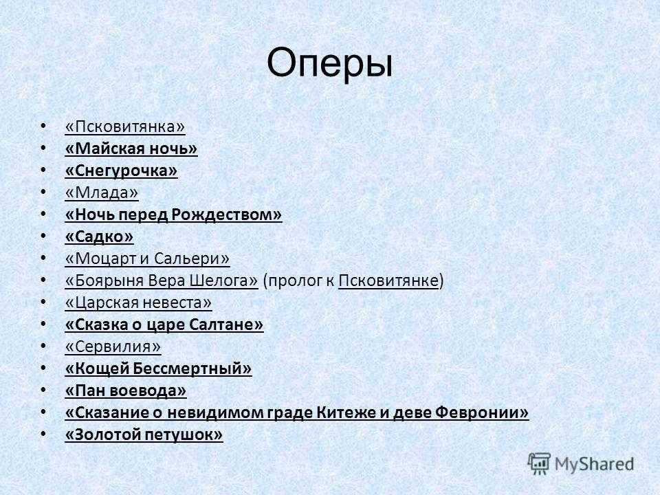 Снегурочка, Ночь перед Рождеством, Садко, Царская невеста, Сказка о царе Салтане, Кащей Бессмертный, Пан воевода, Сказание о невидимом граде Китеже и деве Февронии, Золотой петушок, все это бессмертные произведения великого Русского композитора Н.А.Римского-Корсакова.