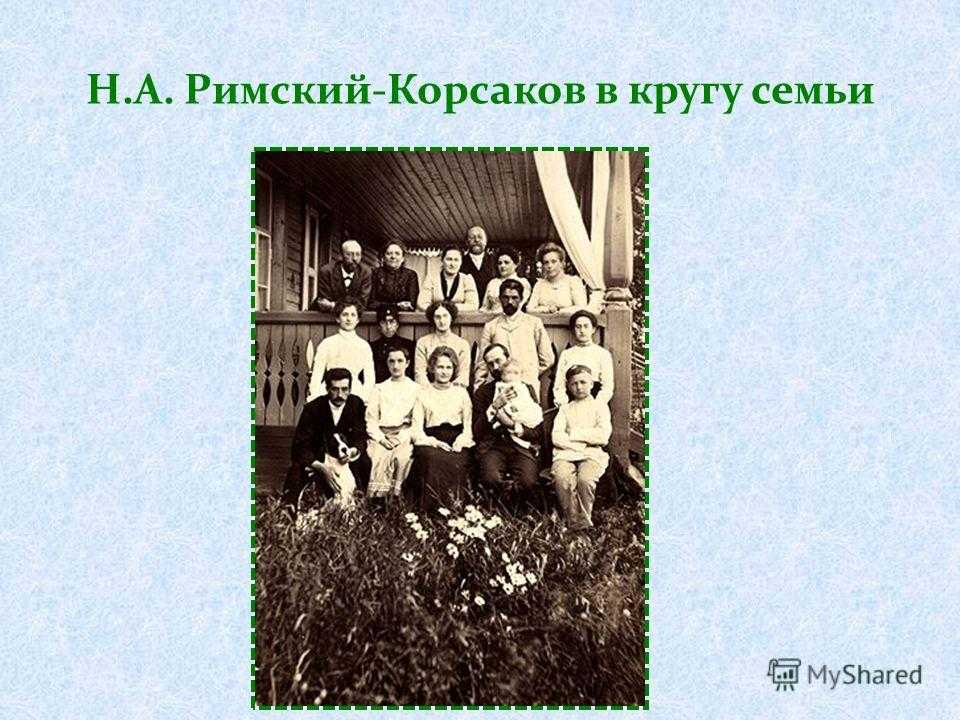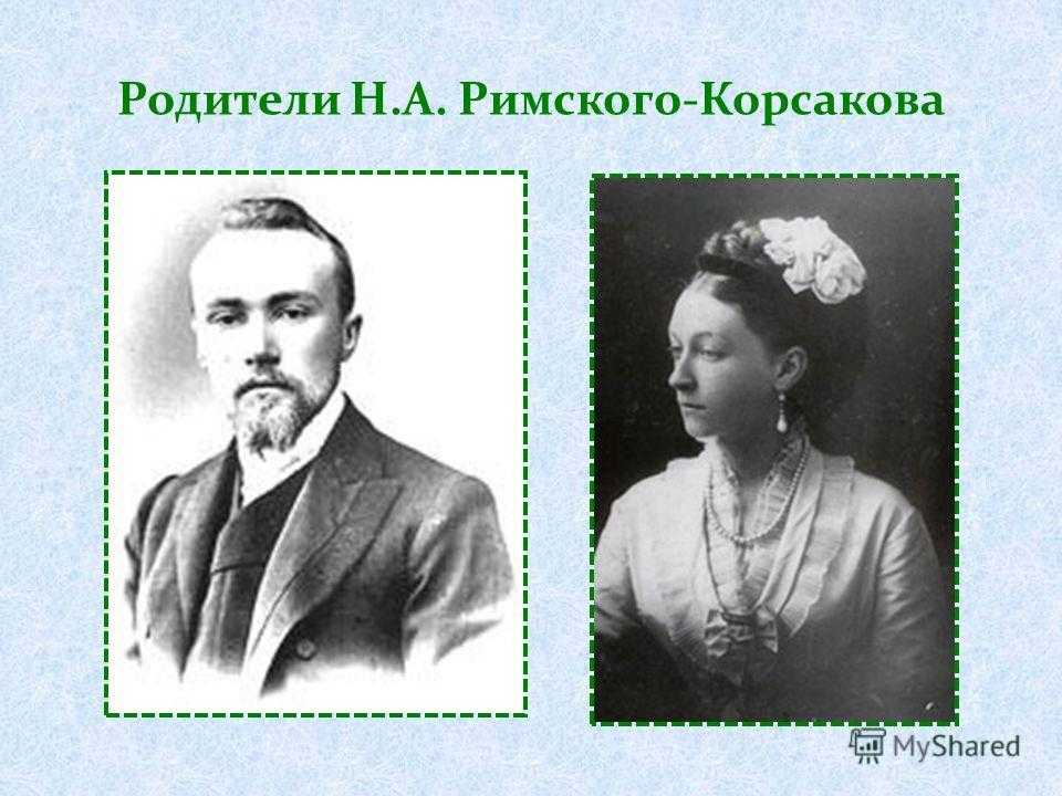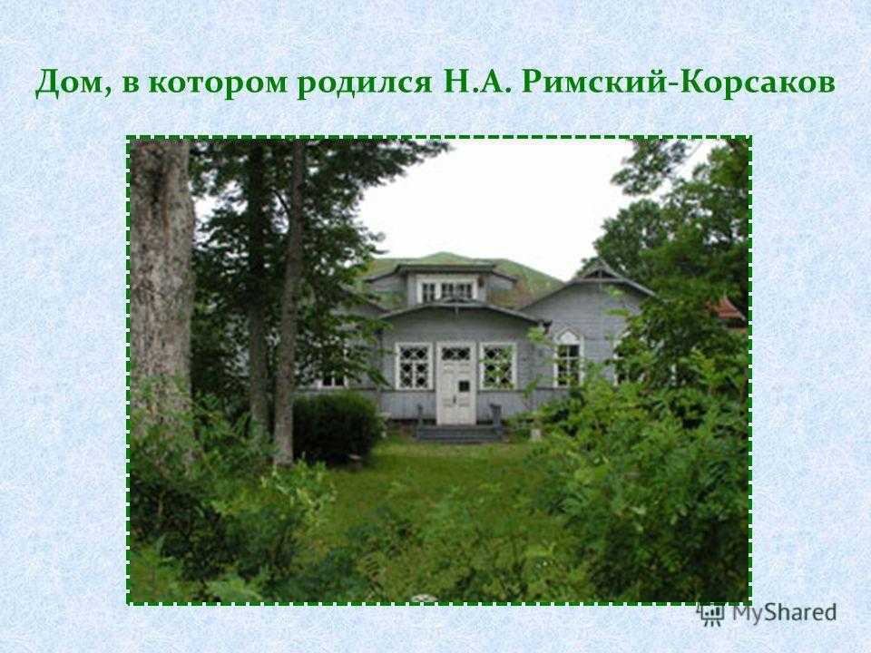 Римский-Корсаков родился в семье, далекой от художественных интересов. Родители, по семейной традиции, готовили мальчика к службе на флоте (моряками были дядя и старший брат). Хотя музыкальные способности выявились очень рано, серьезно заниматься в маленьком провинциальном городке было не у кого. Уроки фортепианной игры давала соседка, потом знакомая гувернантка и ученица этой гувернантки. Музыкальные впечатления дополняли народные песни в любительском исполнении матери и дяди и культовое пение в Тихвинском мужском монастыре.