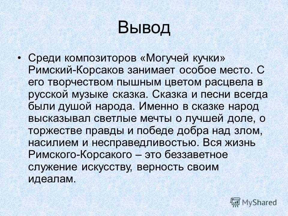 Вывод Среди композиторов «Могучей кучки» Римский-Корсаков занимает особое место. С его творчеством пышным цветом расцвела в русской музыке сказка. Сказка и песни всегда были душой народа. Именно в сказке народ высказывал светлые мечты о лучшей доле, о торжестве правды и победе добра над злом, насилием и несправедливостью. Вся жизнь Римского-Корсакого – это беззаветное служение искусству, верность своим идеалам.
