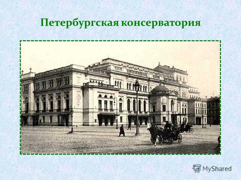 В 1871 году Римский-Корсаков был приглашен в число профессоров Петербургской консерватории и занимал эту должность на протяжении почти четырех десятилетий. Теперь Петербургская консерватория носит имя Н.А.Римского-Корсакова. Слева около здания Консерватории — на Театральной площади — есть памятник Римскому-Корсакову.