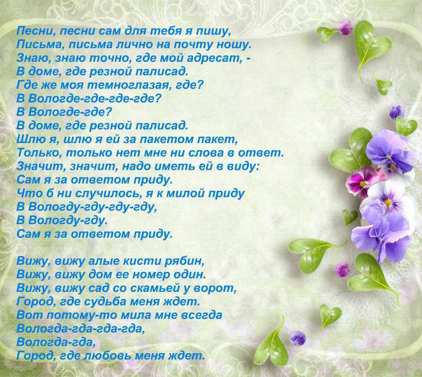 Застольная песня «Вологда» давно пользуется популярностью. Ни одно застолье не обходится без этой замечательной песни. Причем, написана песня была в далеком 1956 году, а популярность приобрела лишь только в 1970-х.