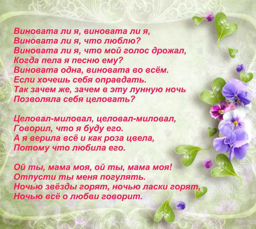 Когда была маленькой то жила у бабушки и деда, тогда по старой традиции собирались их друзья по праздником и пели много хороших песен, вот лова одной(если я заболею, я к врачам обращаться не стану, обращусь я к друзьям, не сочтите что это в бреду. постелите мне степь, занавесьте мне окна туманом, в изголовье повести упавшую с неба звезду)дальше не помню, но песня душевная. и вот ещё одна шуточная(съели и этого, голого раздетого, прямо в саду под бананом)