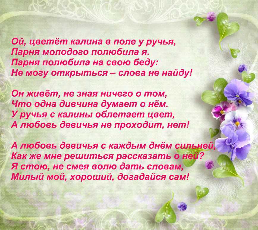 Сpеди обычаев пpекpасныхМне вспомнить хочется один-Он символ веpности и счастьяОт юных лет и до седин. ПРИПЕВ: Ах, этот миг неповтоpимый,Когда стучат, стучат взволнованно сеpдца, Читать далее»