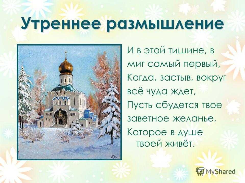 Утреннее размышление И в этой тишине, в миг самый первый, Когда, застыв, вокруг всё чуда ждет, Пусть сбудется твое заветное желанье, Которое в душе твоей живёт.