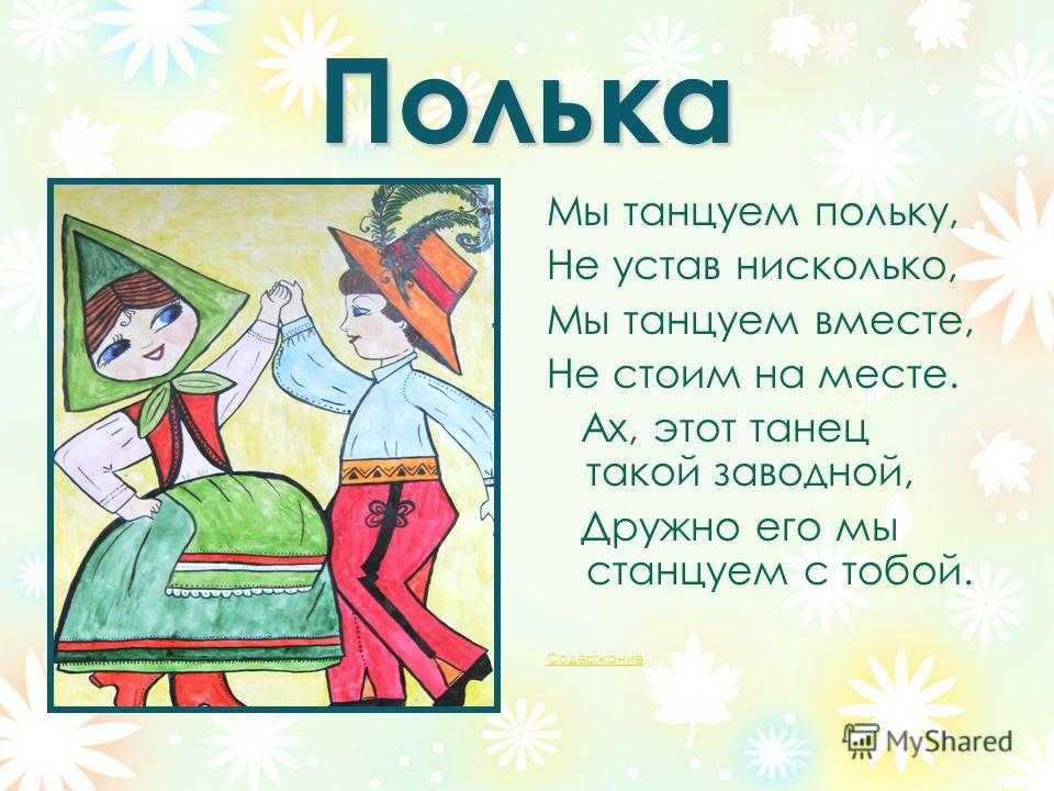 Полька Мы танцуем польку, Не устав нисколько, Мы танцуем вместе, Не стоим на месте. Ах, этот танец такой заводной, Дружно его мы станцуем с тобой. Содержание