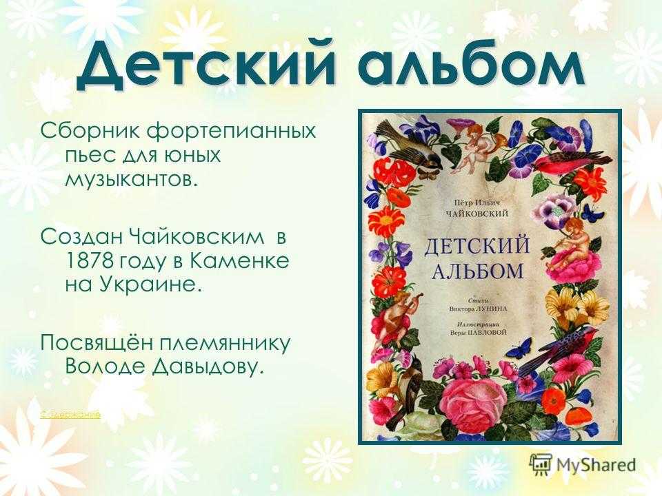 Детский альбом Сборник фортепианных пьес для юных музыкантов. Создан Чайковским в 1878 году в Каменке на Украине. Посвящён племяннику Володе Давыдову. Содержание