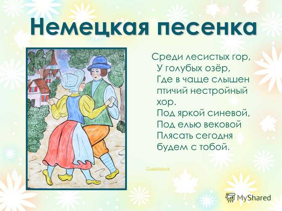 Немецкая песенка Среди лесистых гор, У голубых озёр, Где в чаще слышен птичий нестройный хор. Под яркой синевой, Под елью вековой Плясать сегодня будем с тобой. Содержание