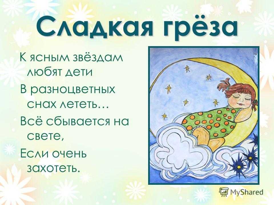 Сладкая грёза К ясным звёздам любят дети В разноцветных снах лететь… Всё сбывается на свете, Если очень захотеть.