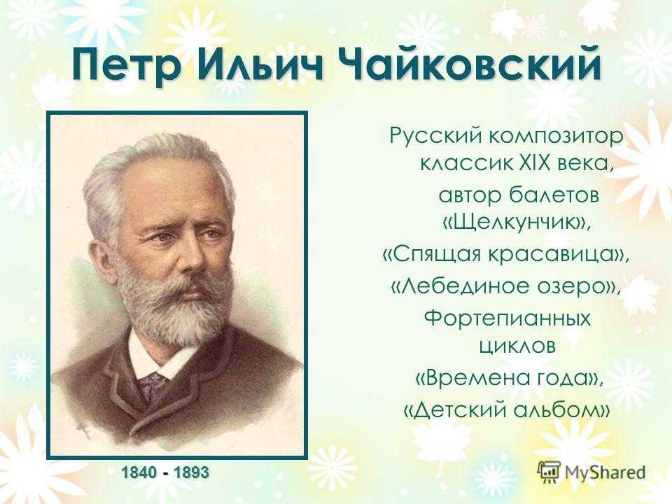 Петр Ильич Чайковский Русский композитор классик XIX века, автор балетов «Щелкунчик», «Спящая красавица», «Лебединое озеро», Фортепианных циклов «Времена года», «Детский альбом»