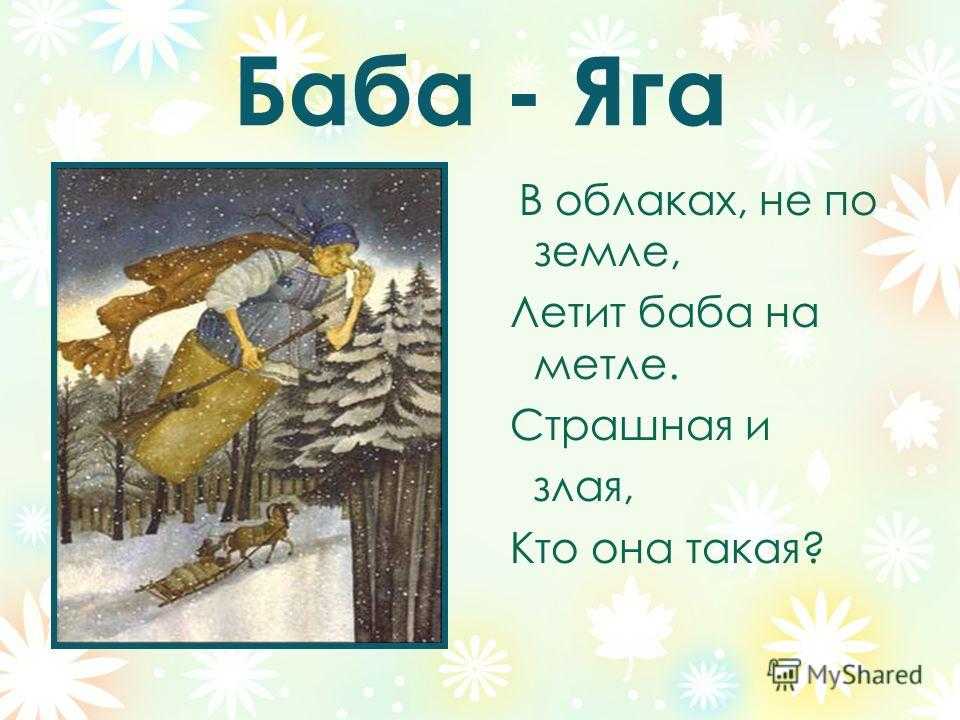 Баба — Яга В облаках, не по земле, Летит баба на метле. Страшная и злая, Кто она такая?