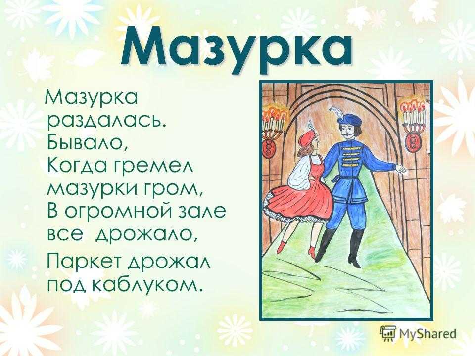 Мазурка Мазурка раздалась. Бывало, Когда гремел мазурки гром, В огромной зале все дрожало, Паркет дрожал под каблуком.