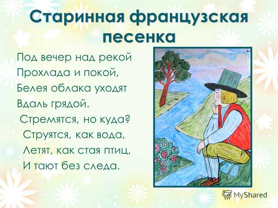 Старинная французская песенка Под вечер над рекой Прохлада и покой, Белея облака уходят Вдаль грядой. Стремятся, но куда? Струятся, как вода, Летят, как стая птиц, И тают без следа.