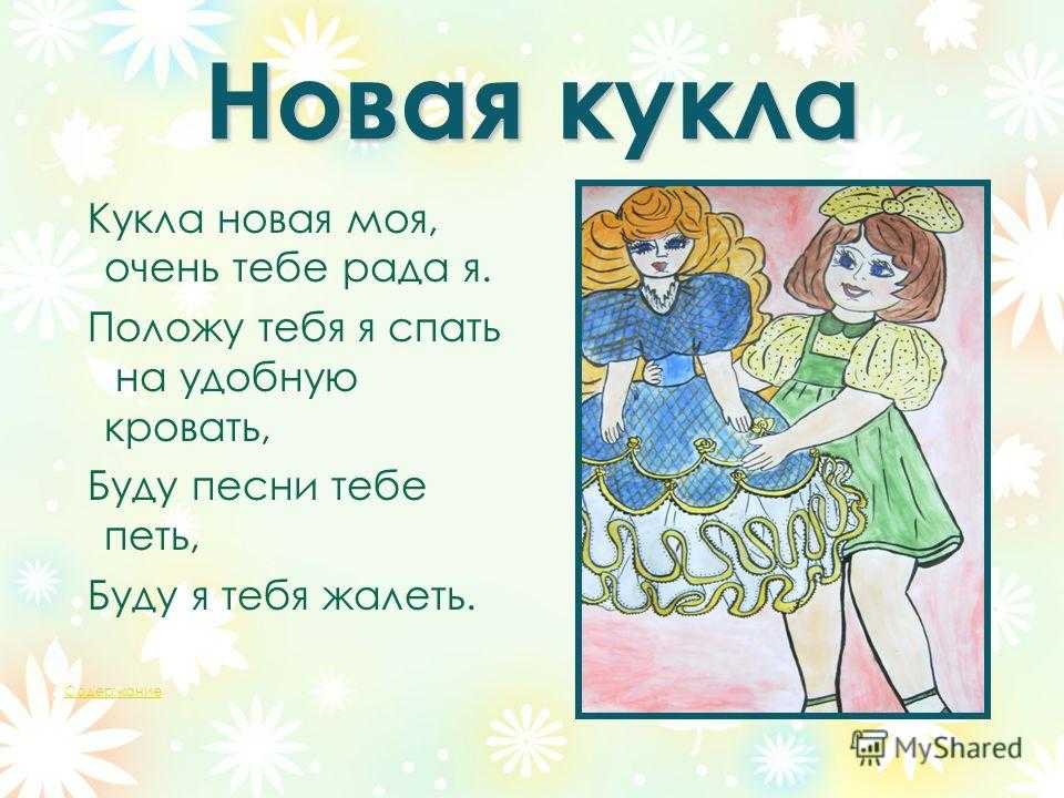 Новая кукла Кукла новая моя, очень тебе рада я. Положу тебя я спать на удобную кровать, Буду песни тебе петь, Буду я тебя жалеть. Содержание
