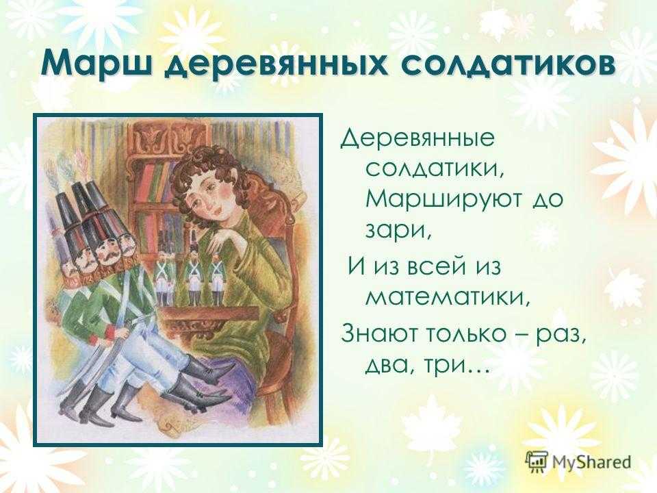 Марш деревянных солдатиков Деревянные солдатики, Маршируют до зари, И из всей из математики, Знают только – раз, два, три…